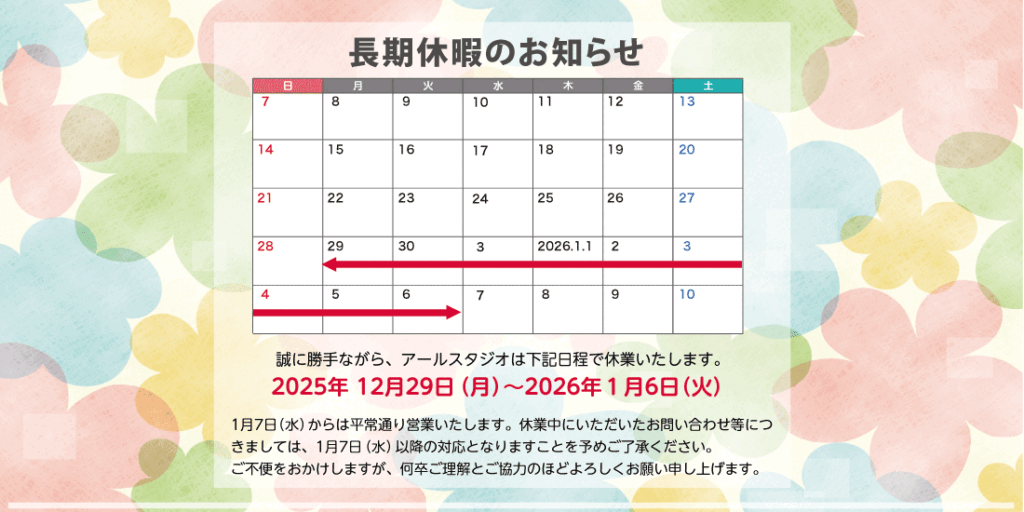 2025年12月29日(月)~2026年1月6日(火)まで年末年始休暇を頂いております。